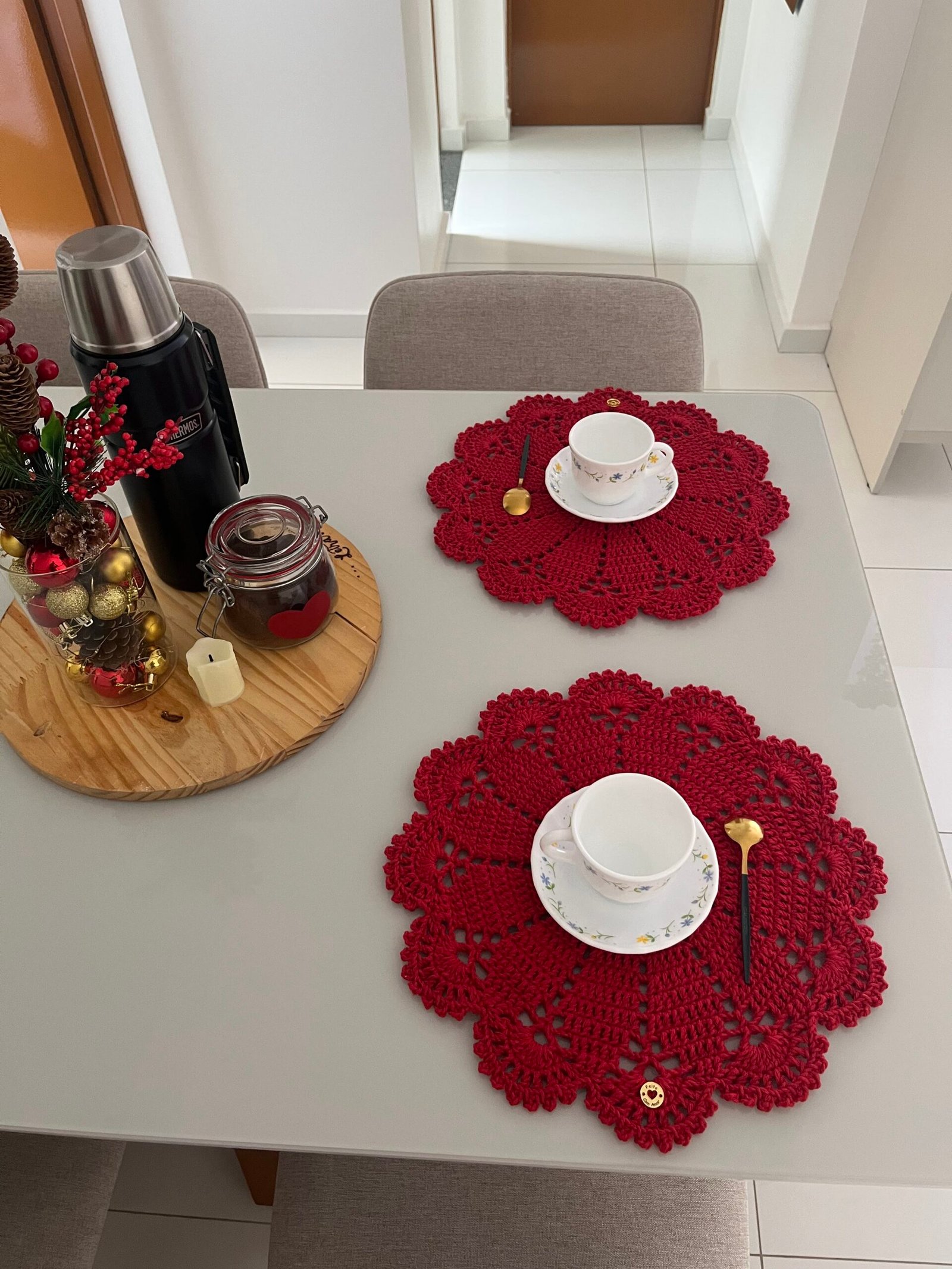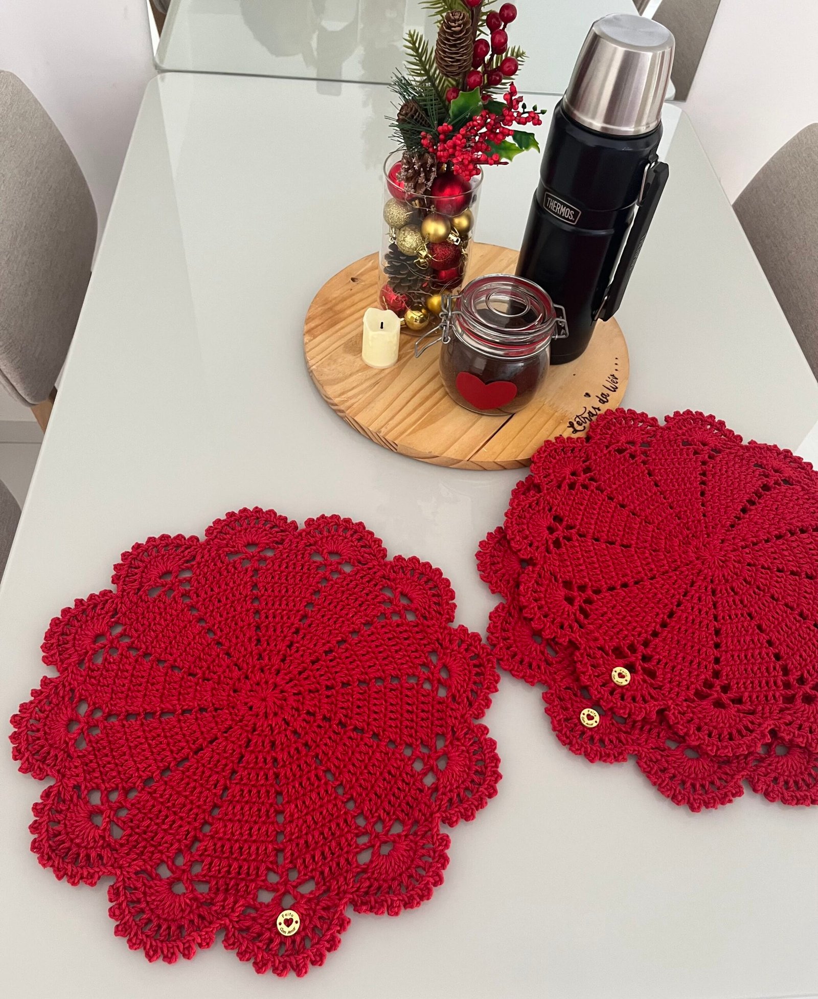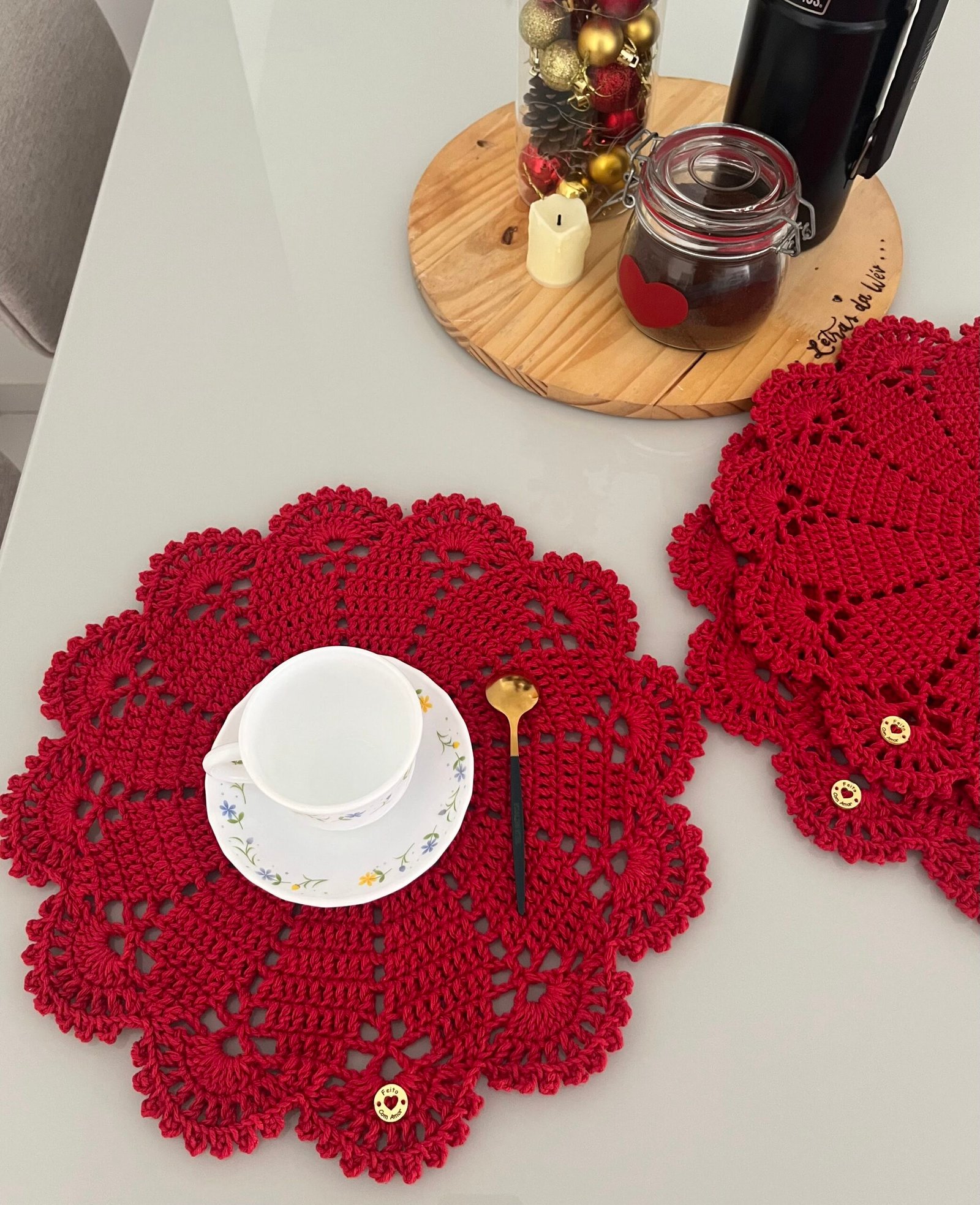 Cada peça mede aproximadamente 37cm de diâmetro, ideal para compor mesas de 2,4, 6 ou até 8 lugares com elegância e aconchego artesanal. Produzido com fio 85% algodão, esse modelo une beleza, qualidade e durabilidade.